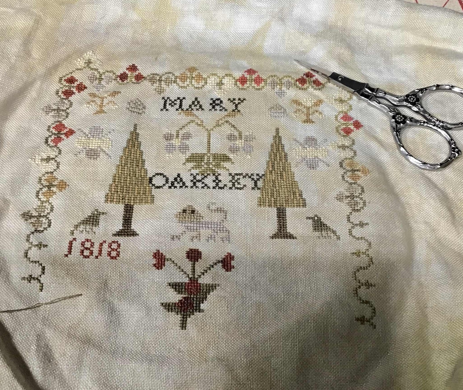 I am about 1/3 of the way done . This is my first time stitching on 40 ct. Linen and I love the way that it looks. Linking up with Kathy at Slow Sunday Stitching. Go on over and see what everyone is working on.