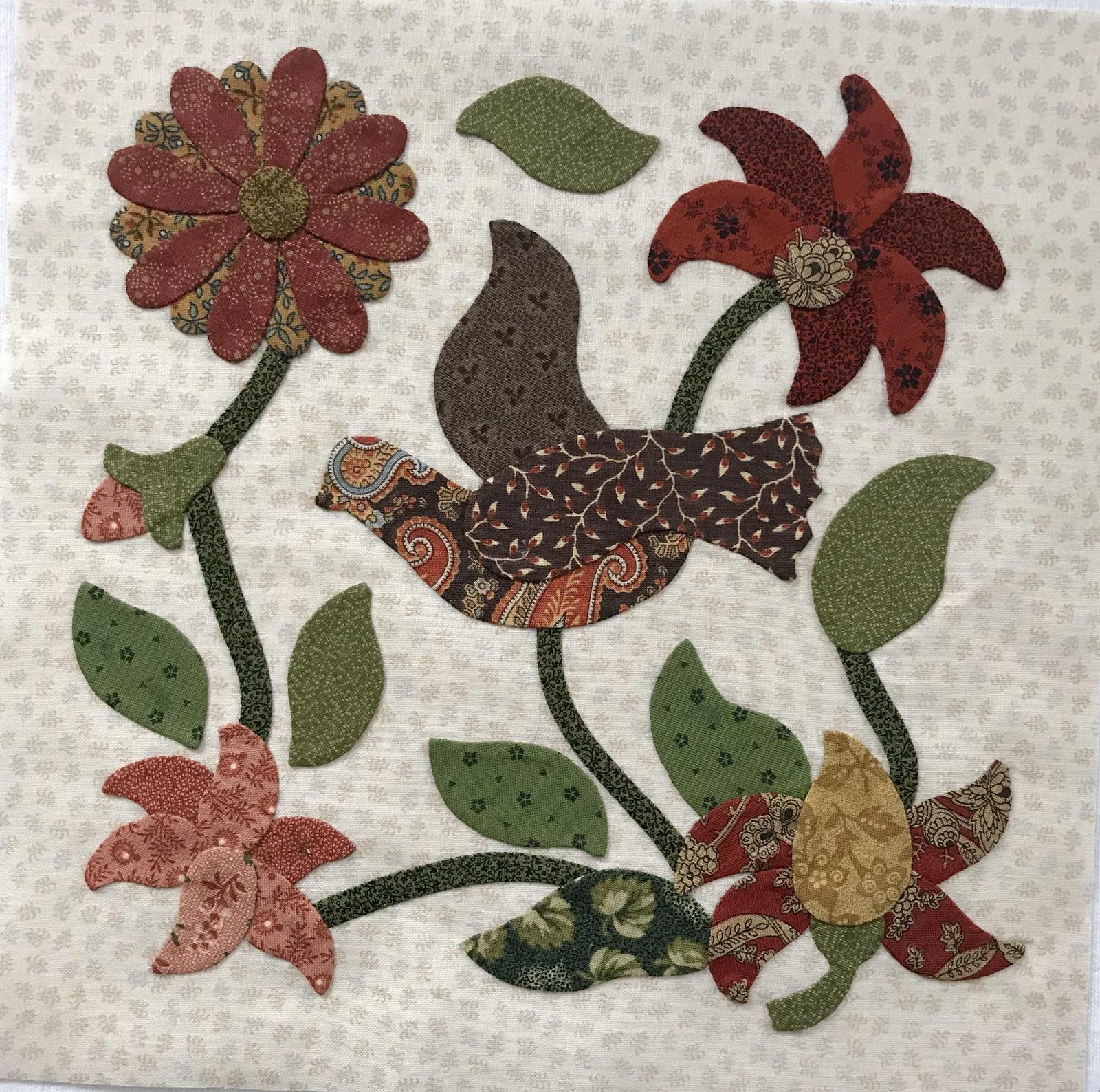 ReplyDeleteYou used interesting fabrics for the bird. I like that. And your fussy cut flower center was a good choice too. You are making good progress, Jennie. I am so glad to have you in our little sew-along group.